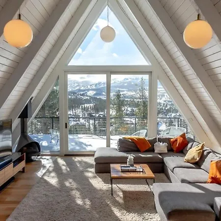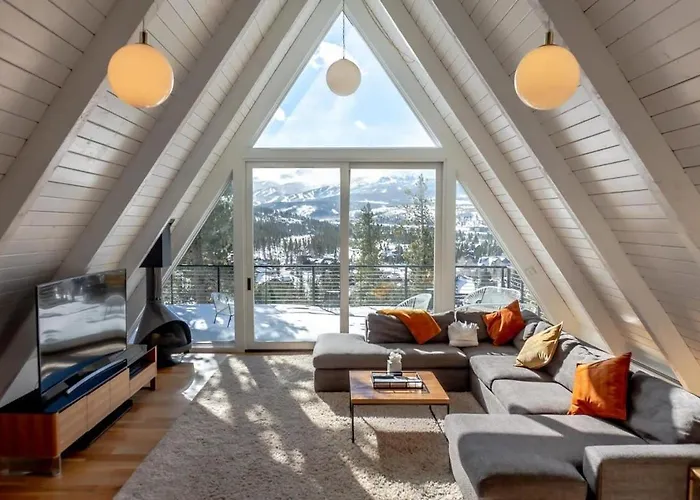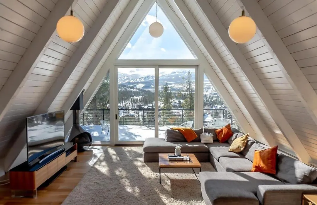 Die 4-Zimmer-Villa 5Bd Modern A Frame Close To Ski Runs And Golfing Breckenridge liegt in 16 Gehminuten Entfernung vom Gold Run Nordic Center und verfügt über eine Terrasse mit Blick auf die Berge.
